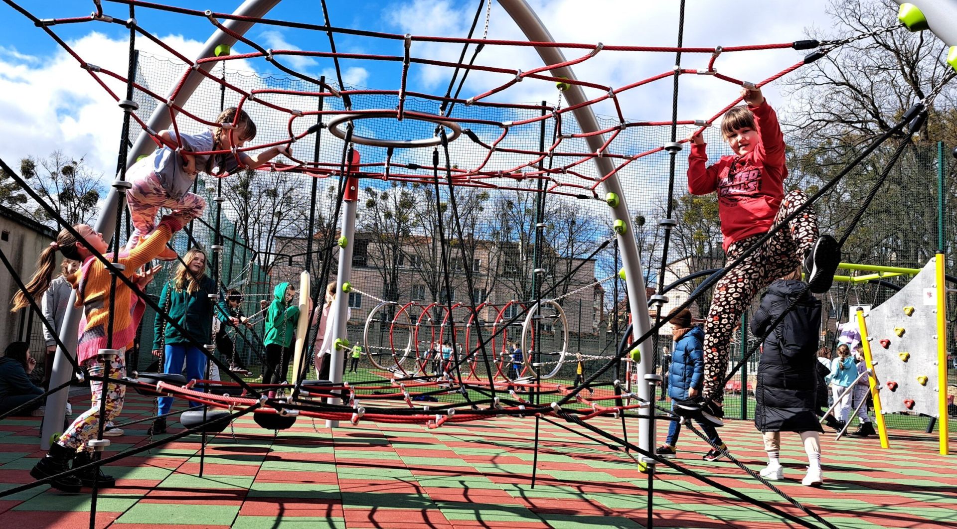 Kolorowe sprzęty zachęcają do rozrywki i stymulują rozwój fizyczny dzieci. Nowe miejsce zabawy i rozrywki pokochali nie tylko najmłodsi uczniowie. Producentem urządzeń jest renomowana firma Buglo, natomiast montaż zapewniła toruńska firma JORDAN.