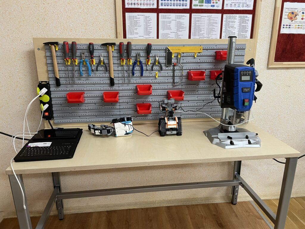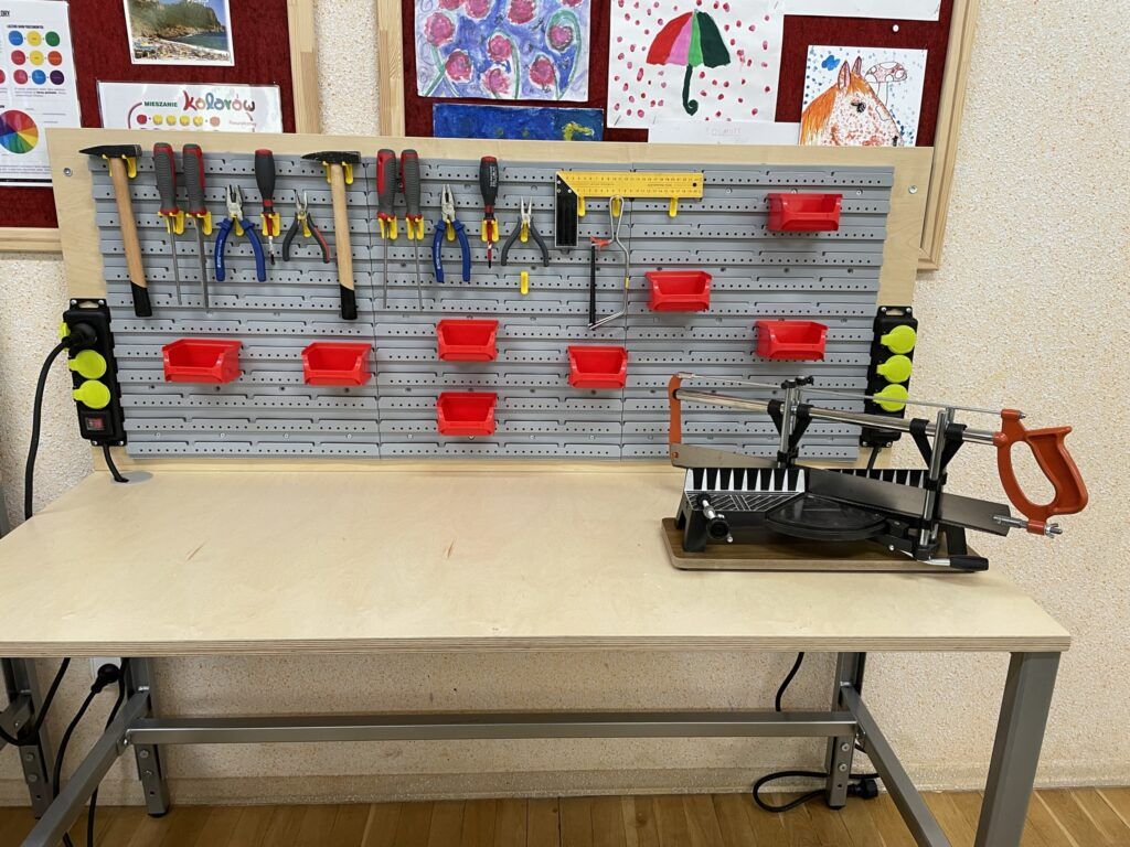 Z programu Laboratoria Przyszłości zakupiliśmy stoły warsztatowe na zajęcia techniki. Na tylnej ściance zamontowaliśmy narzędzia. Na stole wiertarka z celownikiem laserowym oraz piła ramowa kątowa ukośnica do drewna!